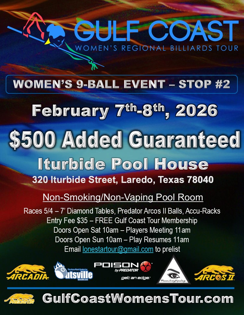 The Gulf Coast Tour’s mission is to advance the level of skill and competition for its female pool players, encourage outside interest and participation in its events through its players, sponsors, and spectators, and cooperate with other like-minded, billiard organizations engaged in the promotion of the sport of billiards. It is the duty of the Tour, to protect the mutual interests of its players, to cause for the creation and development of future events, and improve conditions of the game and its atmosphere whenever, and wherever possible.