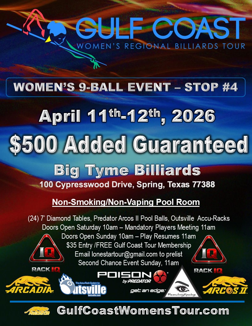 Smith, Lawrence, Nickerson, Julian, Rocha, PetersonCourtney Peters went undefeated at the sixth stop on the Gulf Coast Tour, held at Big Tyme Billiards in Spring, Texas. Peters faced off with Natalie Rocha in the final, taking her out in Continue Reading →
